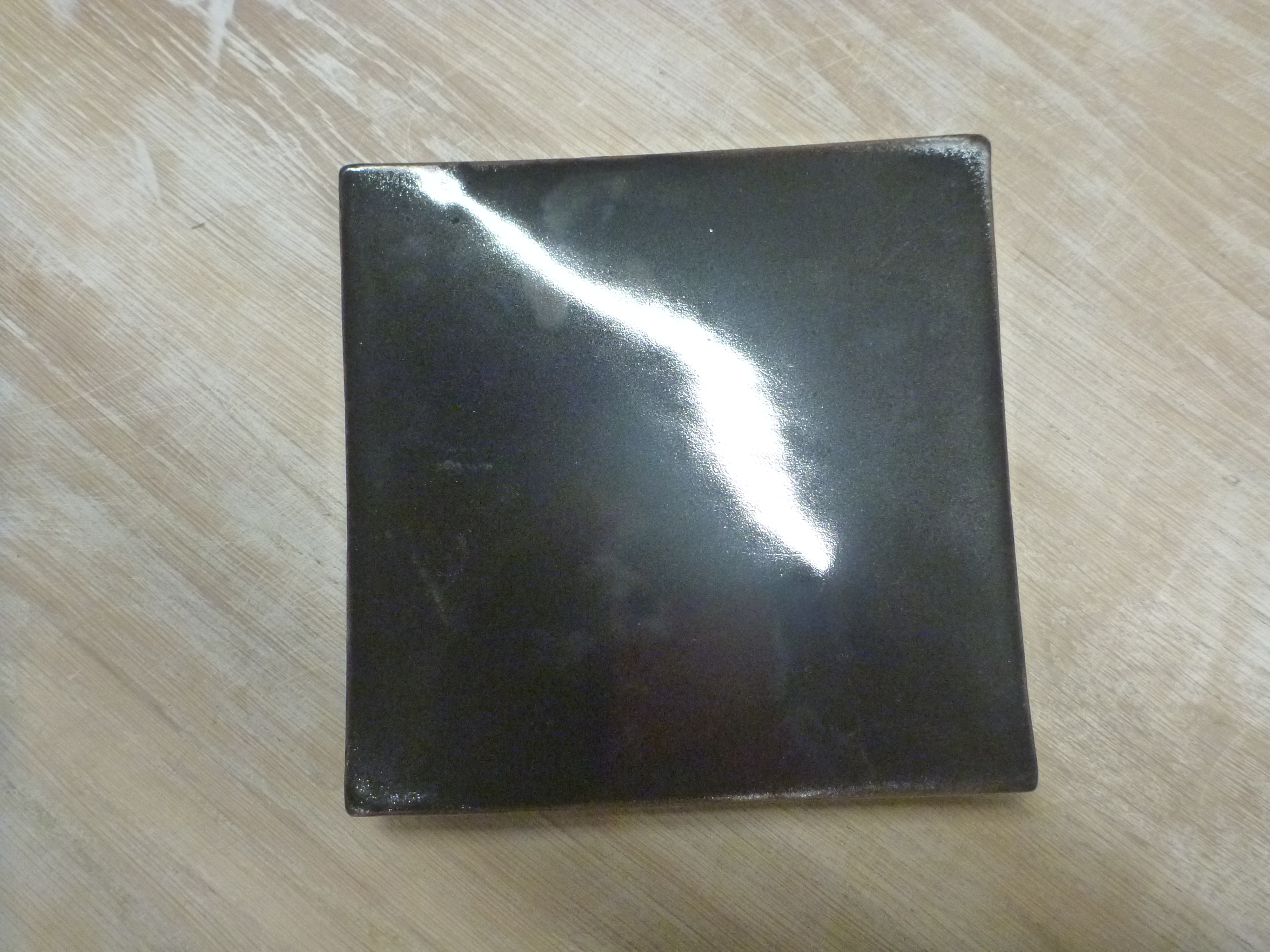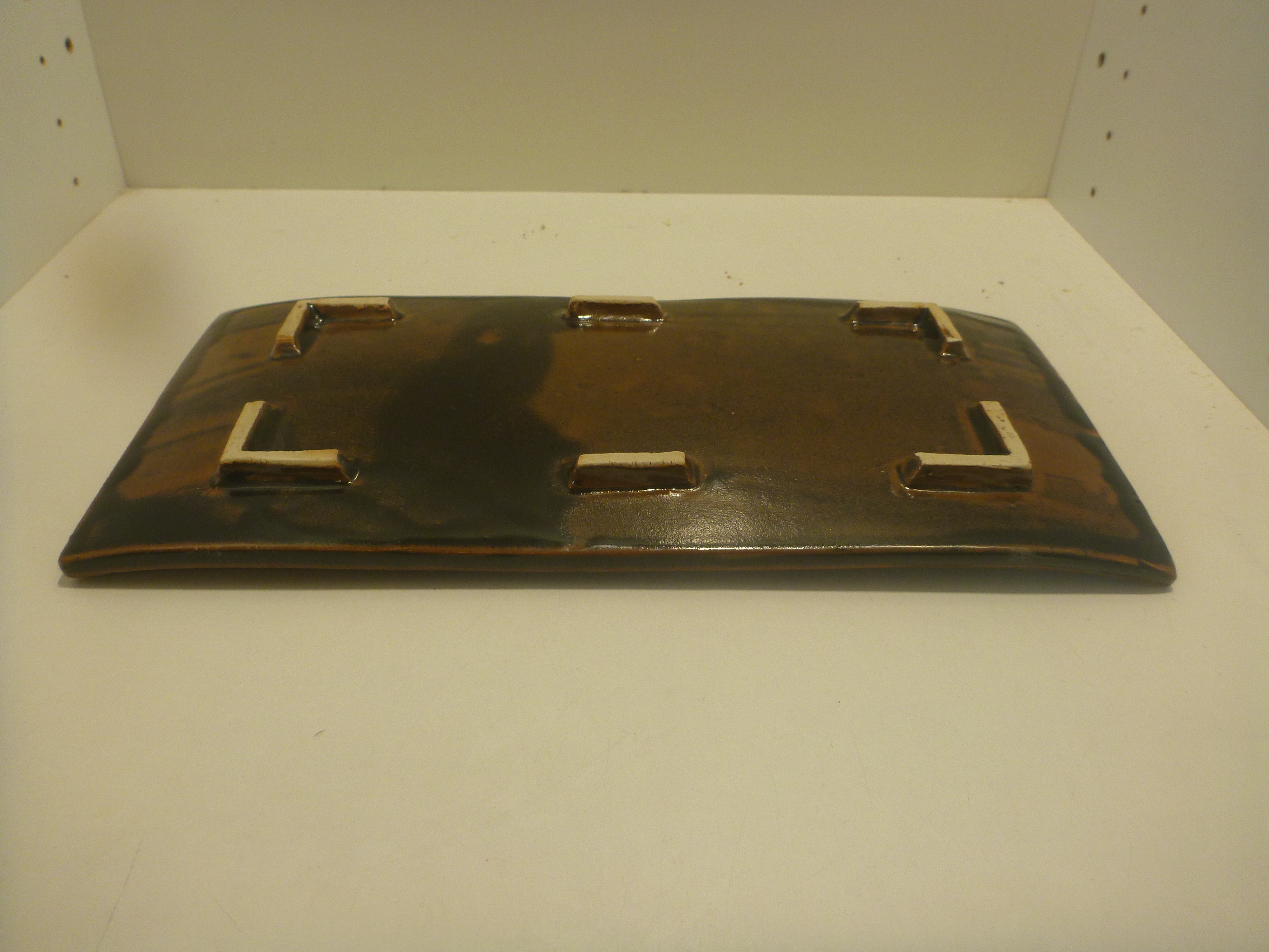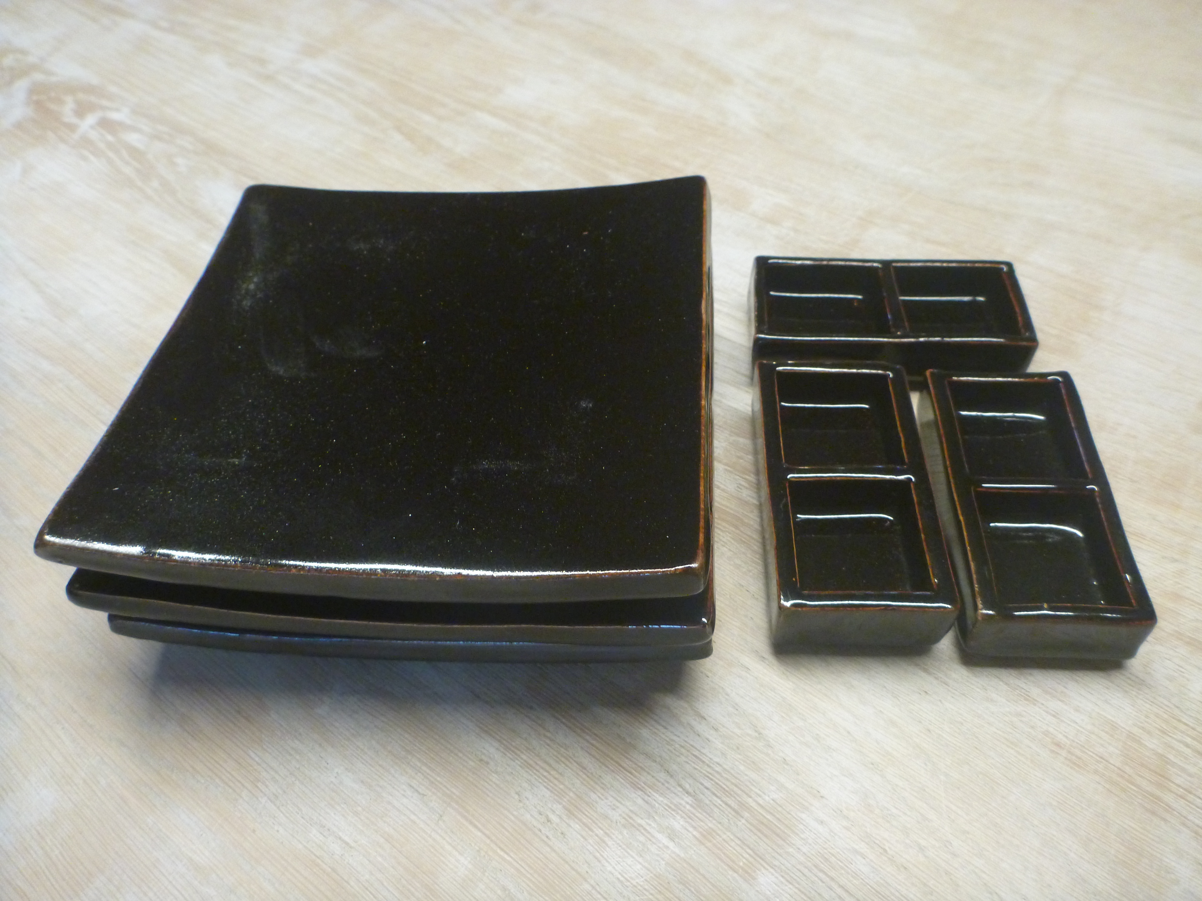 Larege rectangular plates with 6 supprts and square plates with 4 supports for serving sushi, finished with smooth and shiny Japanese iron-based brown glazing ("Hamada Rust" Kogecha). These plates can also be used for serving tapas, deserts, cakes etc. The dark brown color will make the colors of anything served on them stand out.