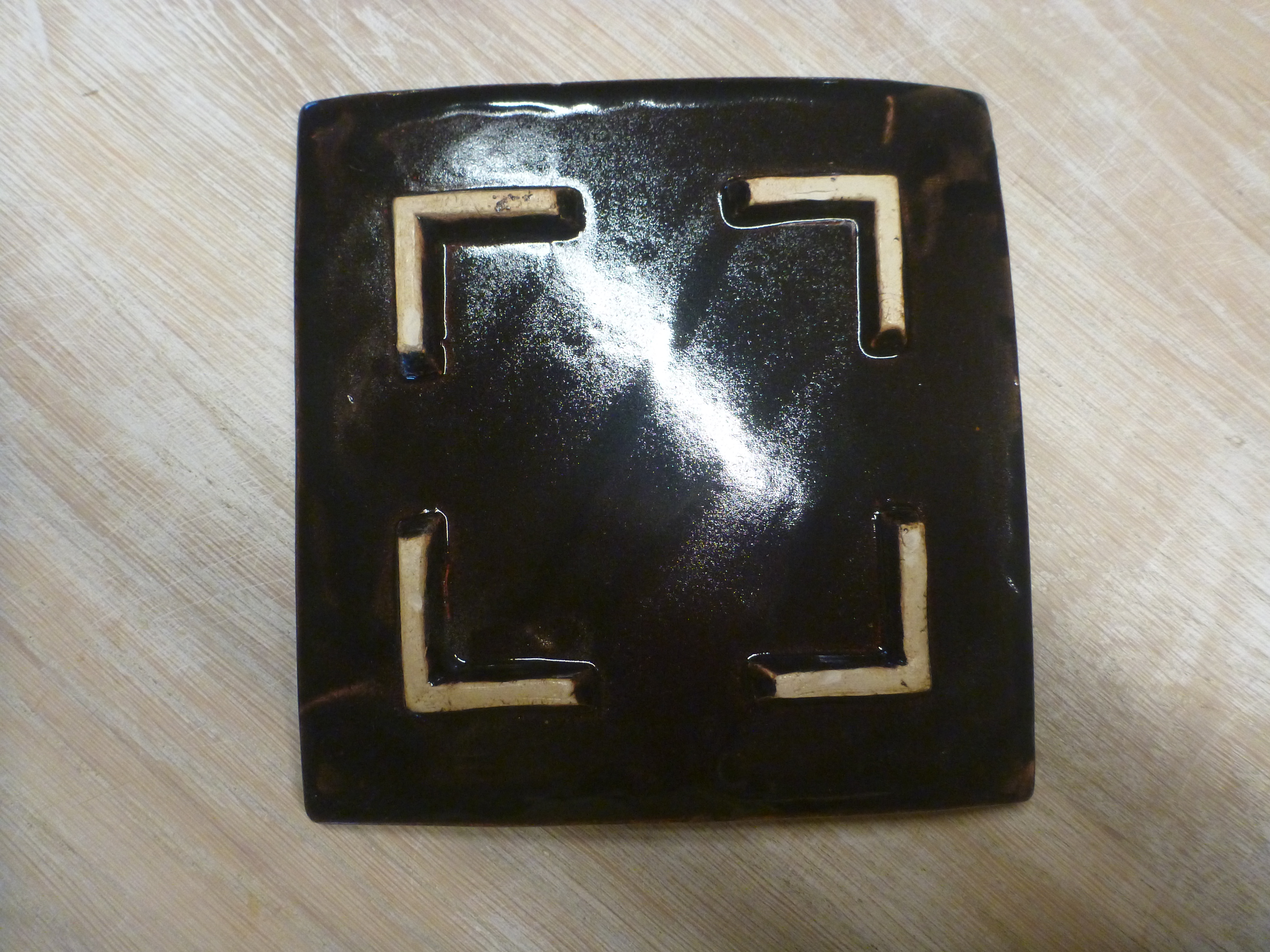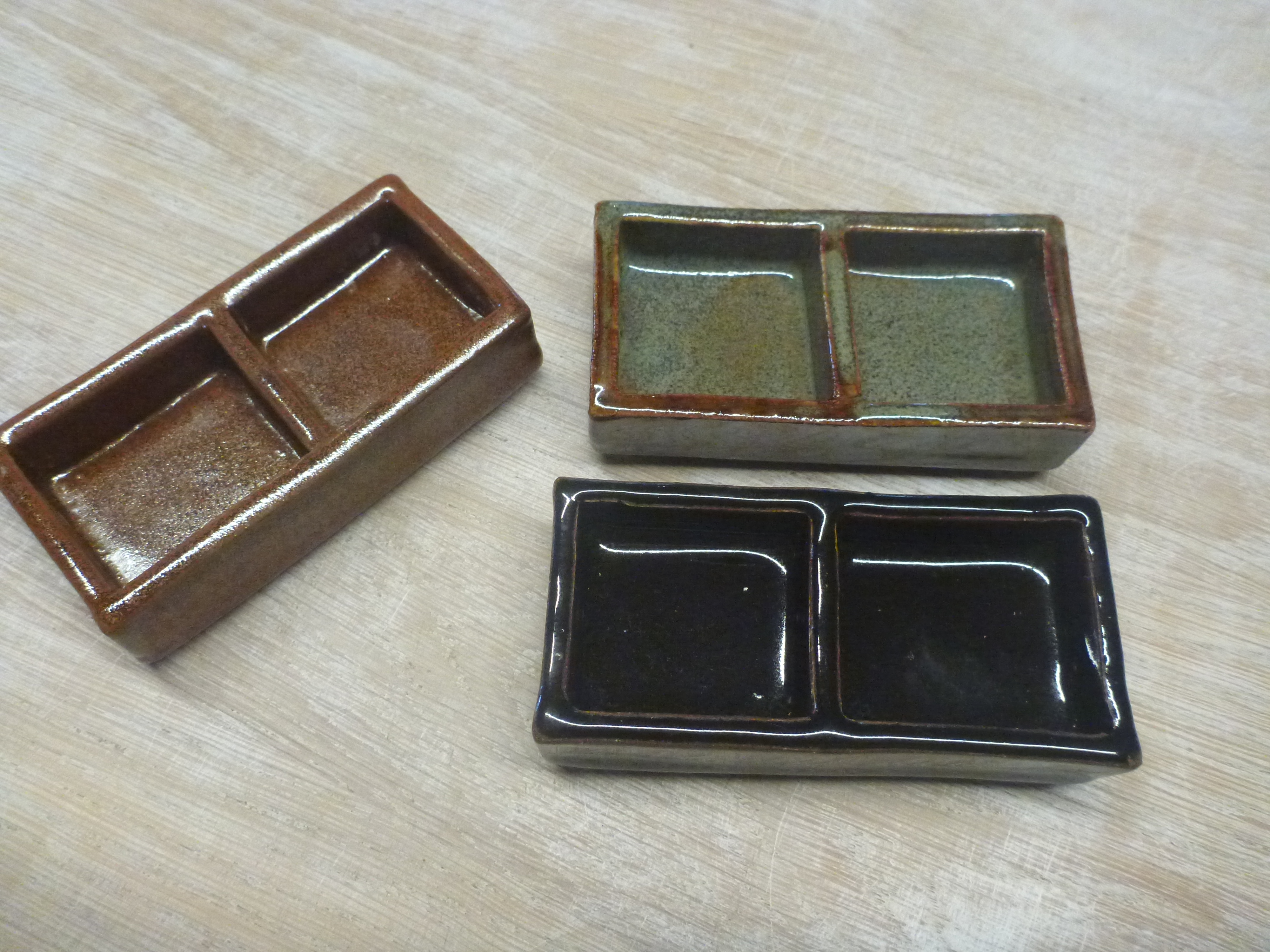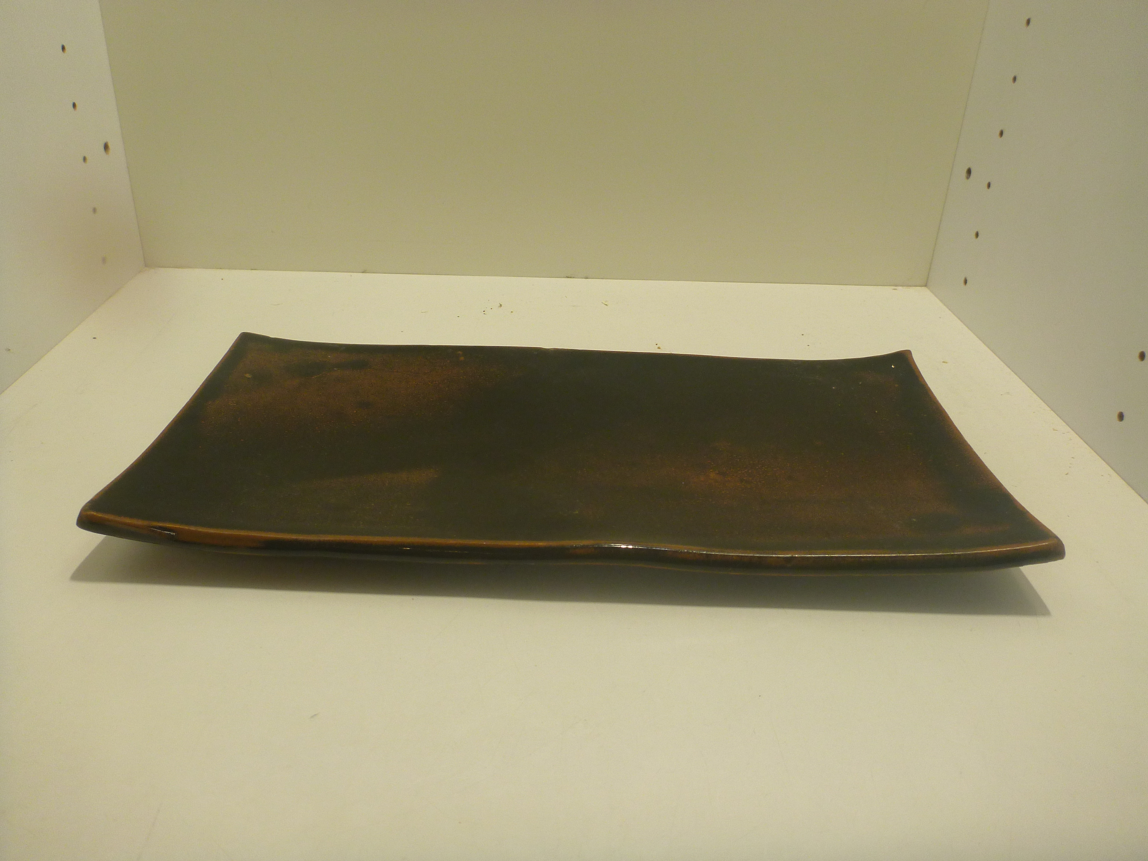 Larege rectangular plates with 6 supprts and square plates with 4 supports for serving sushi, finished with smooth and shiny Japanese iron-based brown glazing ("Hamada Rust" Kogecha). These plates can also be used for serving tapas, deserts, cakes etc. The dark brown color will make the colors of anything served on them stand out.